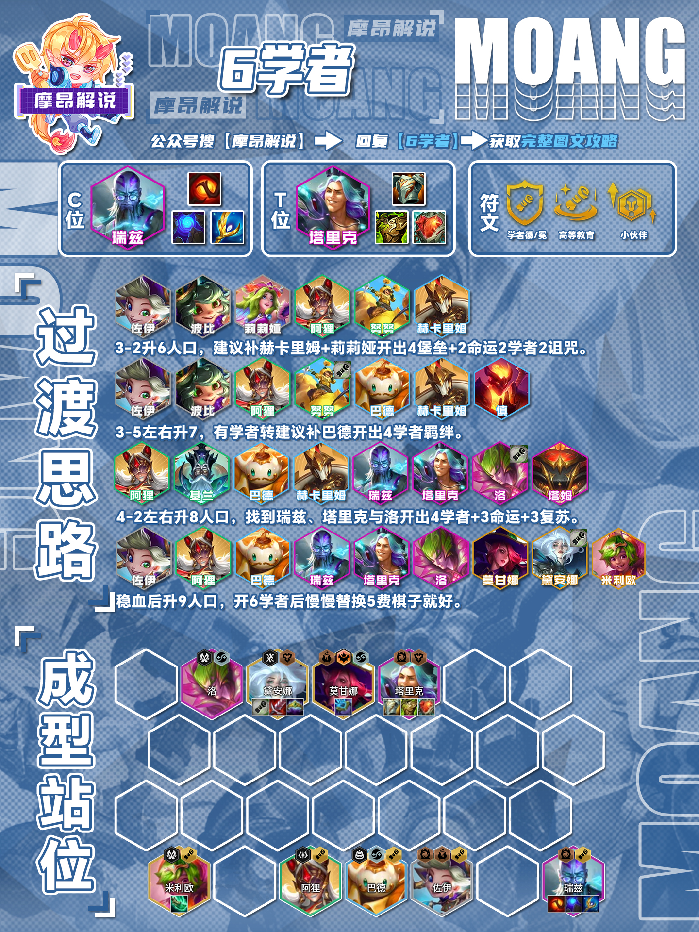 云顶之弈14.21版本大更新,很多阵容需要重新进行调整,比如6学者阵容,那么云顶之弈14.216学者阵容怎么玩?下面就给大家带来云顶之弈14.216学者阵容推荐。 云顶之弈14.216学者阵容推荐 学者体系在更新后热度变化不大,不论是6学者还是复苏4学者,这套阵容是比较吃运营能力的,刚需阵容升级9人口,阵容的上限在于3枚5费卡的2星,特别是前排的黛安娜与莫甘娜,如果您运营能力不算强,摩昂是不建议考虑的。 本文内容来源于互联网,如有侵权请联系删除。