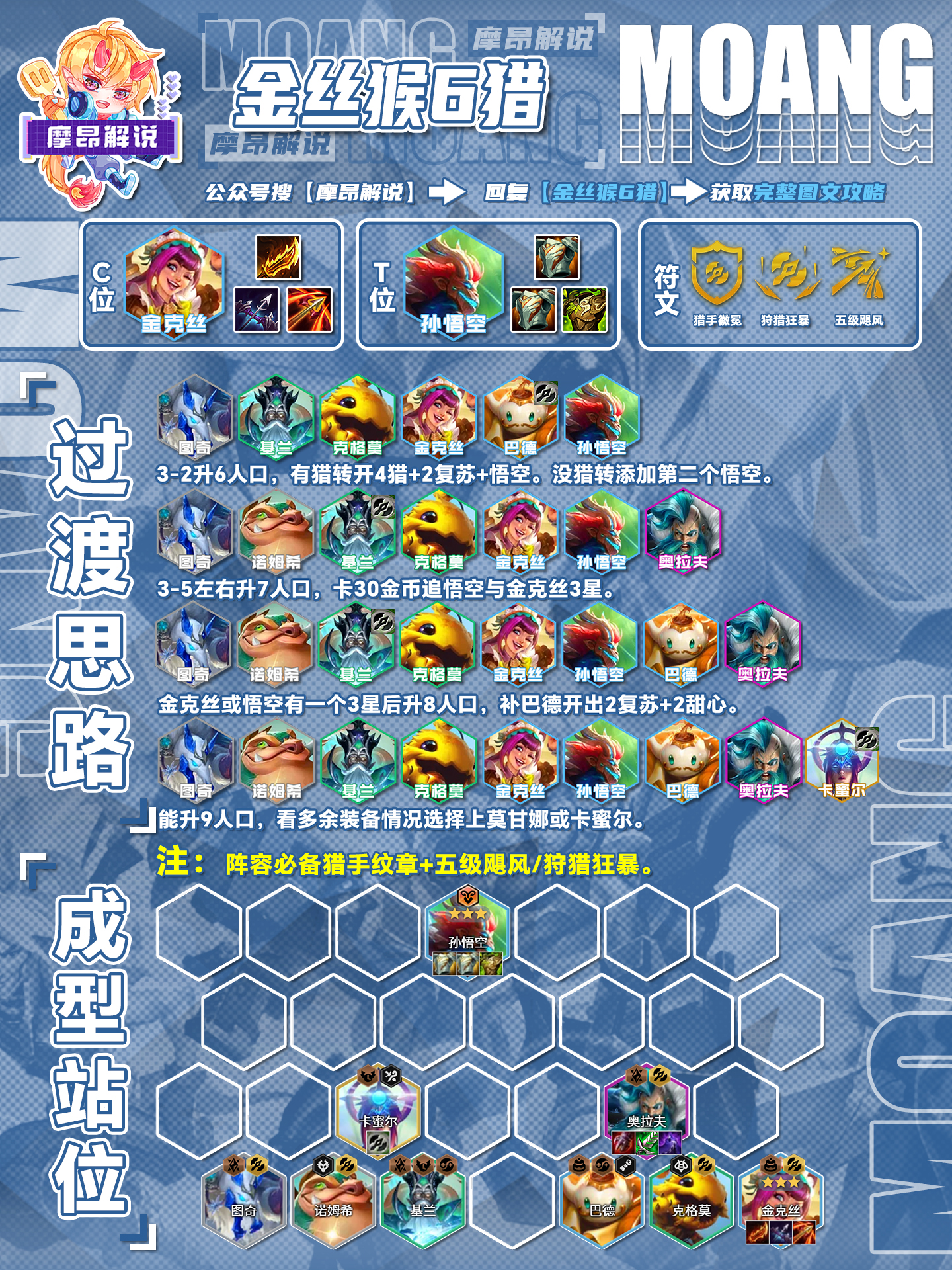 云顶之弈14.21版本大更新,很多阵容需要重新进行调整,比如金丝猴6猎阵容,那么云顶之弈14.21金丝猴6猎阵容怎么玩?下面就给大家带来云顶之弈14.21金丝猴6猎阵容推荐。 云顶之弈14.21金丝猴6猎阵容推荐 金丝猴在更新中可以说被针对的削弱,摩昂本来以为强度大不如前,但测试中感觉强度还是很不错,有五级飓风或狂暴狩猎符文且装备契合的时候还是可以冲。 本文内容来源于互联网,如有侵权请联系删除。
