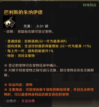 完成‘[宠物] 巴利斯的朱纳伊得’任务的话,可有获得有 ‘增加生活经验值获得量’技能的宠物巴利斯的朱纳伊得作为奖励。