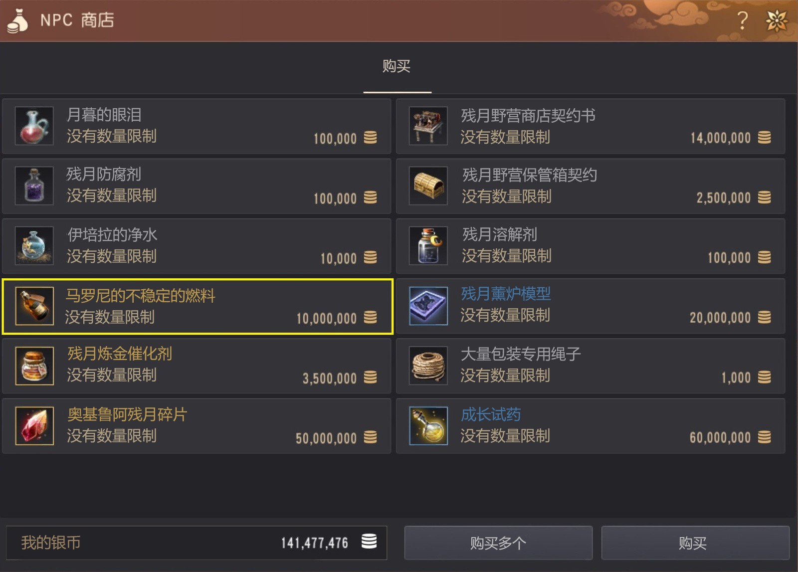 「马罗尼的不稳定的燃料」可与各城镇的残月管理人NPC以10,000,000银币购买。