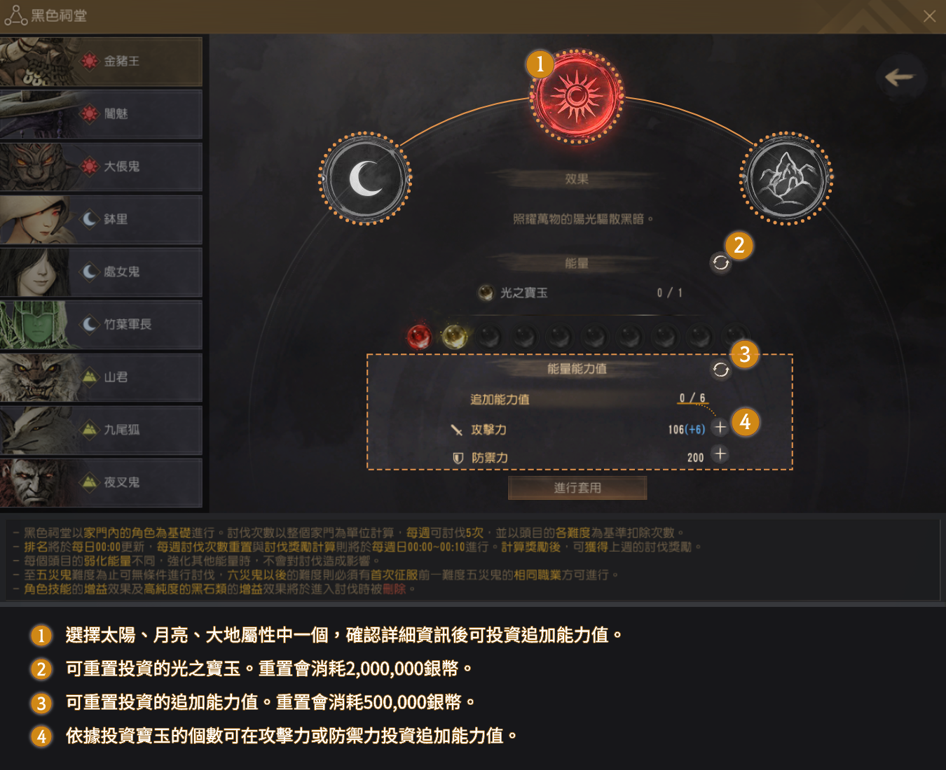 冒险家可以确认各头目具有的太阳/月亮/大地属性的弱点,并在该属性投资,将战斗引导至有利的方向。