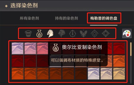 如果正在使用梅勒普的调色盘,在染色选单中可以选择「梅勒普的调色盘」然后选择材质和颜色。