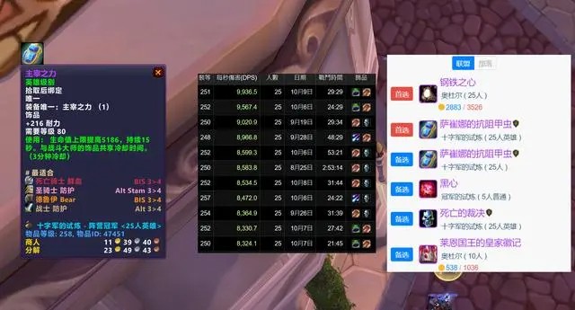 P3防骑生存向的饰品就是奥杜尔的钢铁之心搭配TOC的主宰之力,仇恨向的饰品是暗月伟大加黑暗物质(世界前二的搭配)。