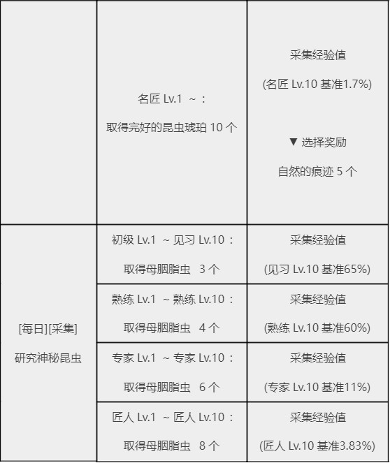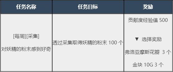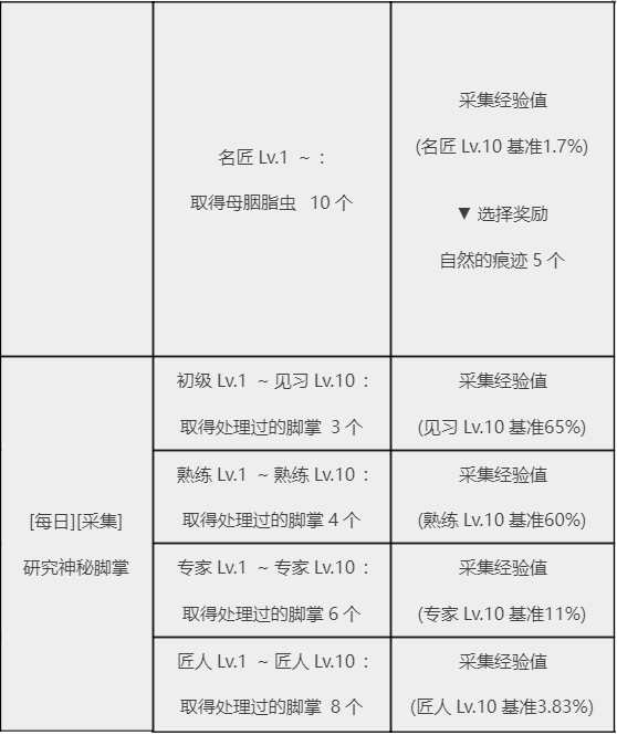 每日任务和每周任务中可以获得采集经验值和「弗洛亚摩斯花瓣」,且「弗洛亚摩斯花瓣」可透过简易炼金制作1小时内生活熟练度100和生活经验值获得量增加20%的「弗洛林秘籍」。