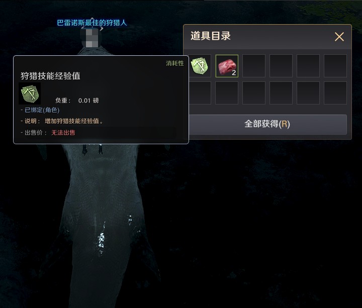 完成狩猎后,淡水鳄鱼的尸体会浮出水面,这时可利用屠宰用刀进行屠宰,即可获得狩猎经验值与肉等物品。