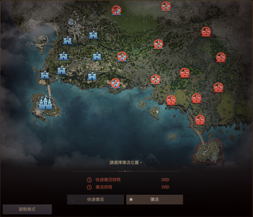 玫瑰战争进行中,参加者在死亡时可以从战术地图上选择可复活的位置来复活。