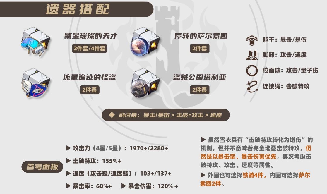 ② 优先暴击/暴伤躯干。虽然雪衣的相关队伍具有不低的击破弱点频率,但是雪衣仍然以自身量子直伤为主,还是优先考虑双暴躯干提高自身技能伤害。