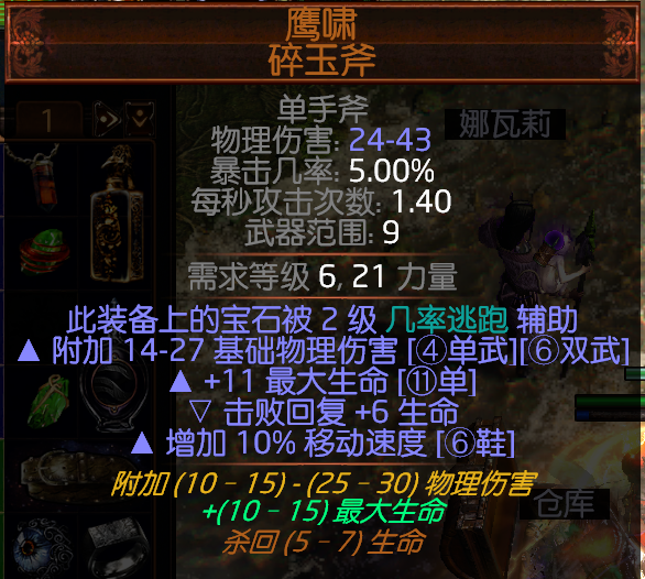 或者你可以选择这把单手斧增加了10%的移动速度,但是猝死几率会提高20%以上(这里的几率全凭长久跑矿洞获得的感觉)