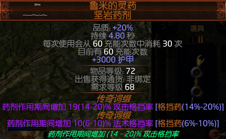迷雾药剂可以增加100%的躲避值,造成的迷雾给以给怪物致盲,不过和致盲仗的属性重复了,属性要求减少药剂消耗,后缀随意。