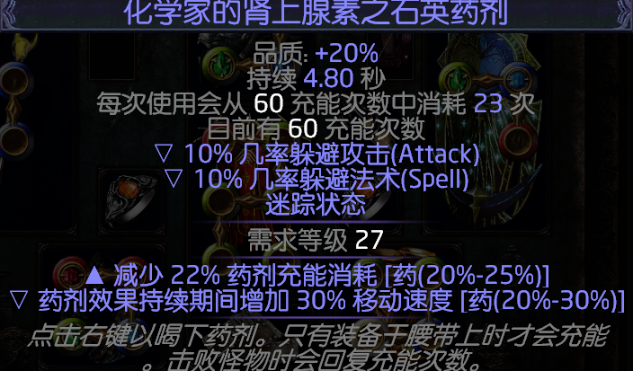 石英药剂增加10%的双躲避,还有迷踪状态可以穿怪,属性选择减少药剂消耗,后缀随意或者选择增加移动速度。