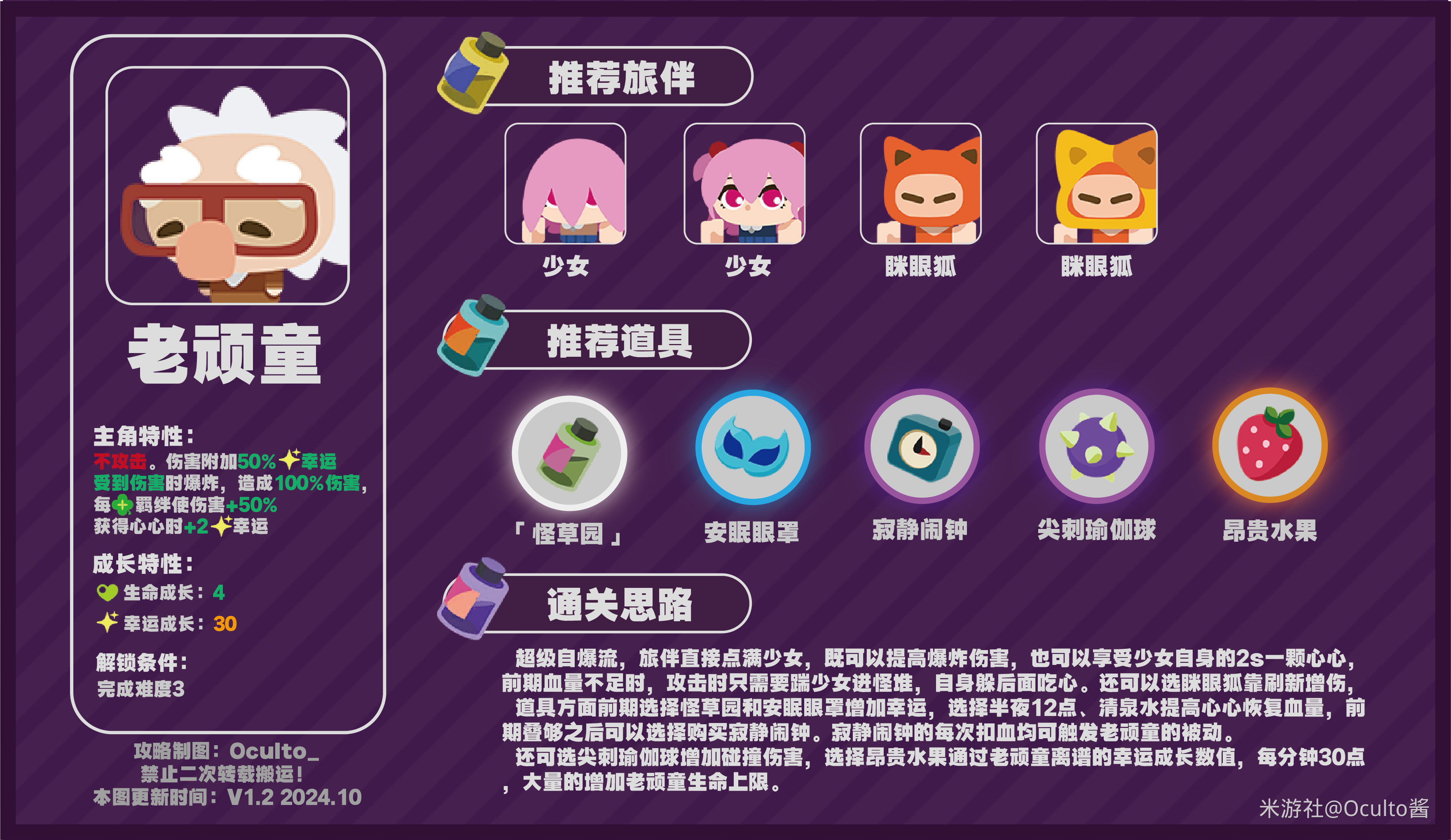 道具方面前期选择怪草园和安眠眼罩增加幸运,选择半夜12点、清泉水提高心心恢复血量,前期叠够之后可以选择购买寂静闹钟。寂静闹钟的每次扣血均可触发老顽童的被动。