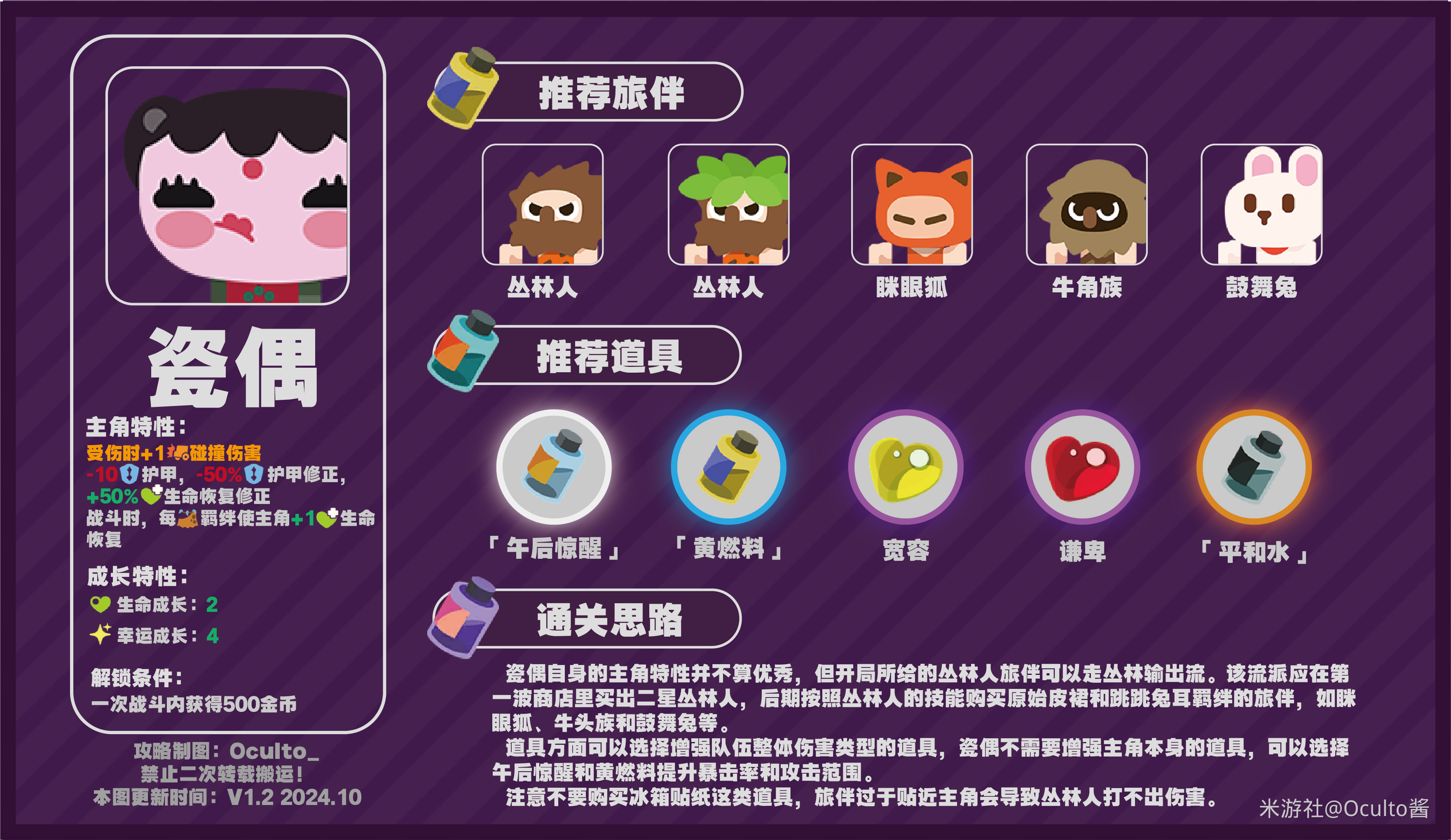 通关思路:瓷偶自身的主角特性并不算优秀,但开局所给的丛林人旅伴可以走丛林输出流。该流派应在第一波商店里买出二星丛林人,后期按照丛林人的技能购买原始皮裙和跳跳兔耳羁绊的旅伴,如眯眼狐、牛头族和鼓舞兔等。