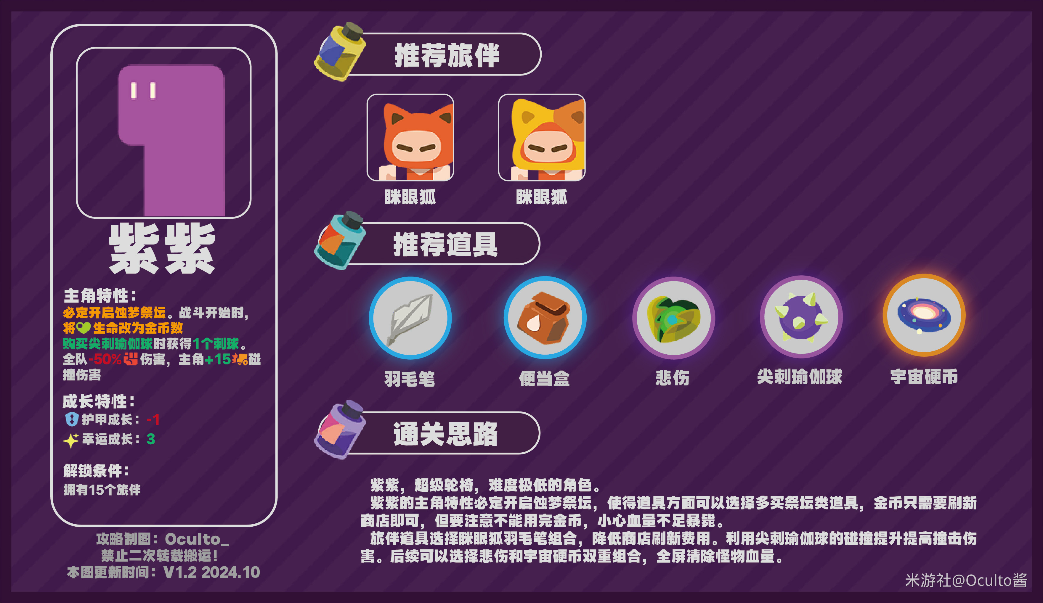 旅伴道具选择眯眼狐羽毛笔组合,降低商店刷新费用。利用尖刺瑜伽球的碰撞提升提高撞击伤害。后续可以选择悲伤和宇宙硬币双重组合,全屏清除怪物血量。