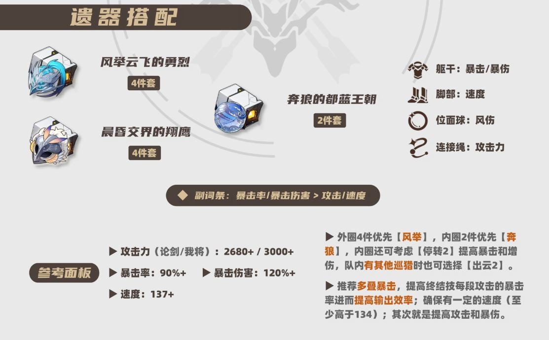 ①外圈4件优先【风举飞云的勇烈】。2件套提高攻击力,4件套提高暴击率、装备者施放追击后还能提高终结技的暴伤,十分契合以追击、战技等手段“暖机”再由终结技作为主要输出手段的飞霄。