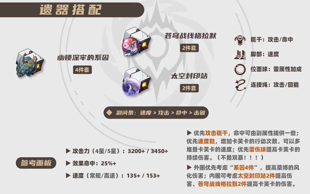 ——如果搭配【苍穹战线格拉默】2件,卡芙卡推荐堆叠更高的速度至160点来完全触发该套装的效果;普通练度也需要在战斗中能至少达到135点保障触发最少1层该遗器的效果。