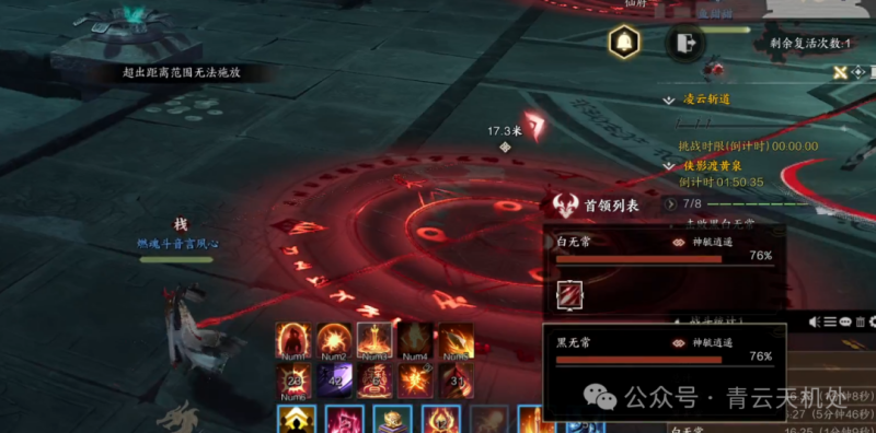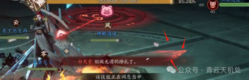 应对:黑无常的死亡镰舞可以打断白无常的罪无可赦。注意不是每一个都可以打断。不能打断的情况下,玩家绕内圈走位规避,或者靠场地边缘走位规避。