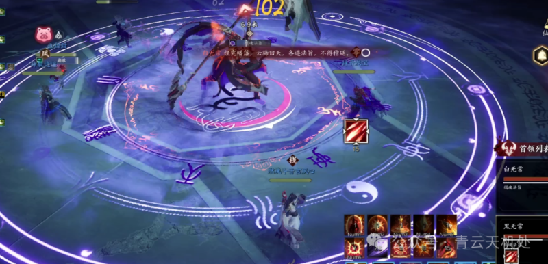 ⑥轮回无常·序:黑无常闪现到场边释放扩散的剑气,之后会连线1名玩家追击。白无常闪现到场边释放2条射线,