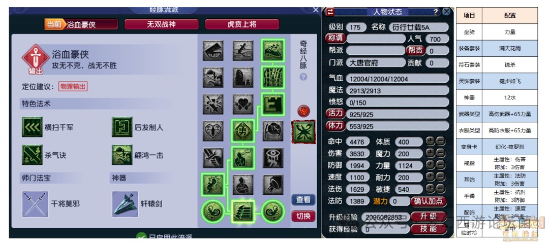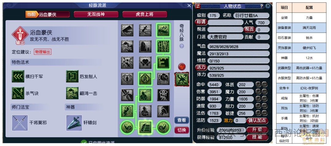 高速大唐装备套装:满天花雨灵饰属性:6伤害,6防御实战分析:力敏加点为主,同时兼顾血量。在《梦幻西游》电脑版中先手方具有极大的优势。力敏加点使得大唐拥有极快的速度,可以确保在对方输出之前出手,可以使用更加多样的战术。既能通过横扫千军提前压低对方血量,也能通过破碎无双打空蓝量使对方无法出手。
