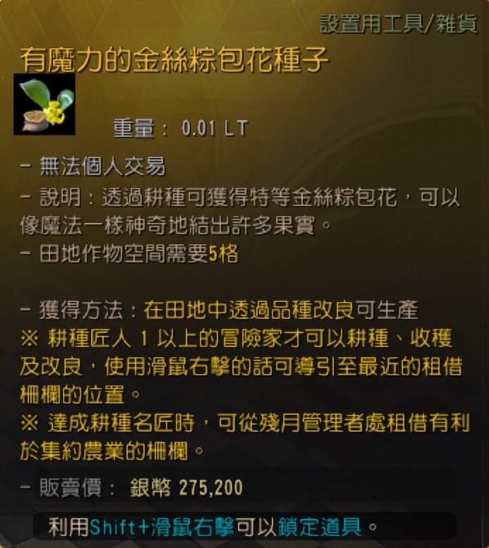 使用耕种匠人1等级以上的角色改良作物时,可以获得“有魔力的金丝粽包花种子”