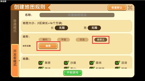 冒险模式的编辑进入方法为创建新世界——冒险模式——高级模式——自定义,在地形设置中进行编辑;开发者模式的编辑进入方法为创建新世界——开发者模式——自定义,在地形设置中进行编辑;在编辑选项中可以分别对:地貌、地表、生物和矿物进行编辑和生成;