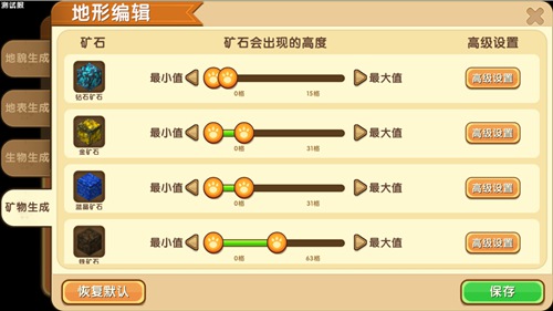④矿物生成:这里我们能选择地图中出现的矿石和出现高度,当然在【高级编辑】中我们还能选择方块样式、数量和密度;