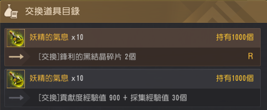 - 妖精的气息 10个:锋利的黑结晶碎片 2个 - 妖精的气息 10个:贡献度经验值 900 + 采集经验值 30个 |