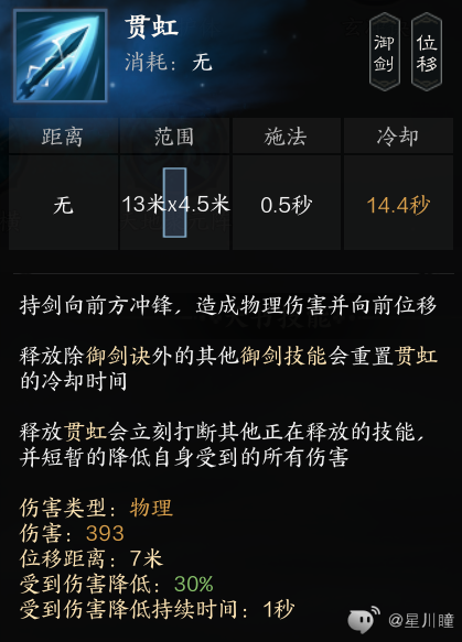 贯虹:流派核心,位移,位移过程中减伤30%,伤害,叠碎星