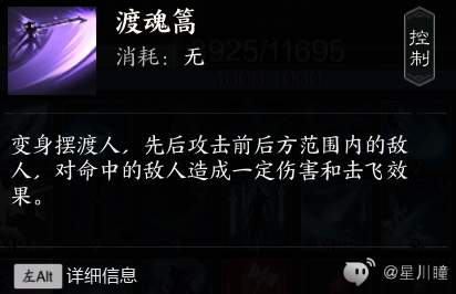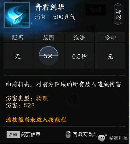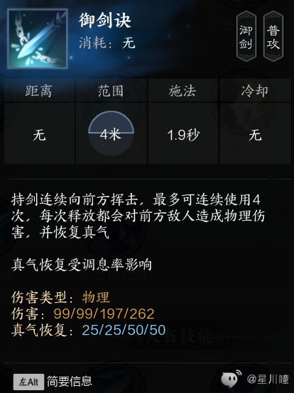 御剑诀:平a,无消耗无冷却,释放会恢复真气(对空气放也会)