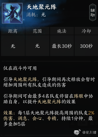 天地聚元阵:释放后以自己为中心展开一个阵,前后左右皆有蓝圈,需队友站上去后,再次释放此技能来获得buff。开战前,持续1分钟,最高可叠至10%所有属性