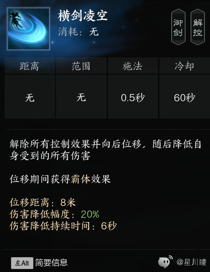 横剑凌空:解控,后撤步,减伤20%,可重置贯虹