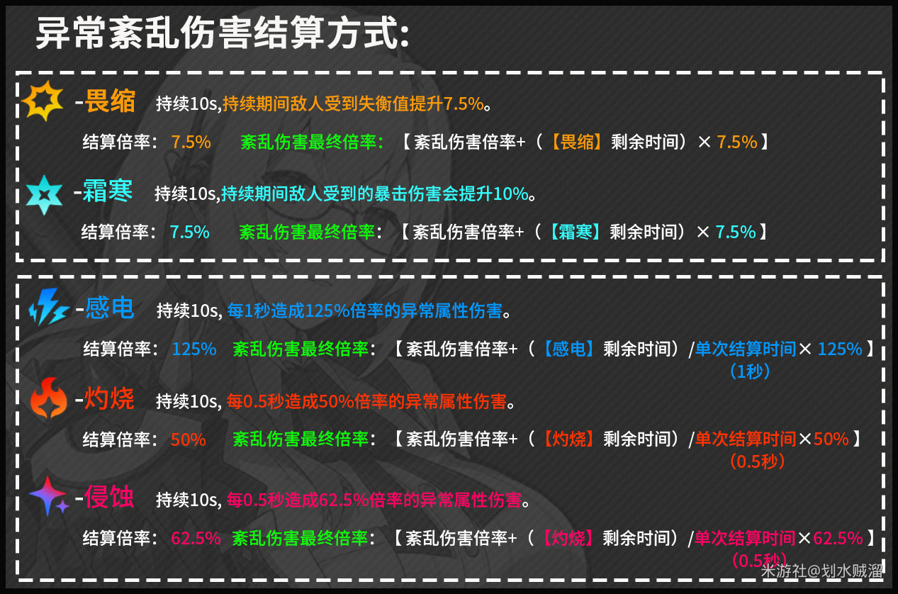 异常伤害为灼烧、感电、侵蚀这类持续造成伤害的异常属性伤可以按照以上方式进行理解,但物理和冰属性异常伤害都是在进入异常状态时就进行结算完成,后续是为敌人施加的负面状态,因此紊乱伤害在结算时结算的为这部分收益的转变;为了方便大家理解,这里准备了结算时各属性的倍率。