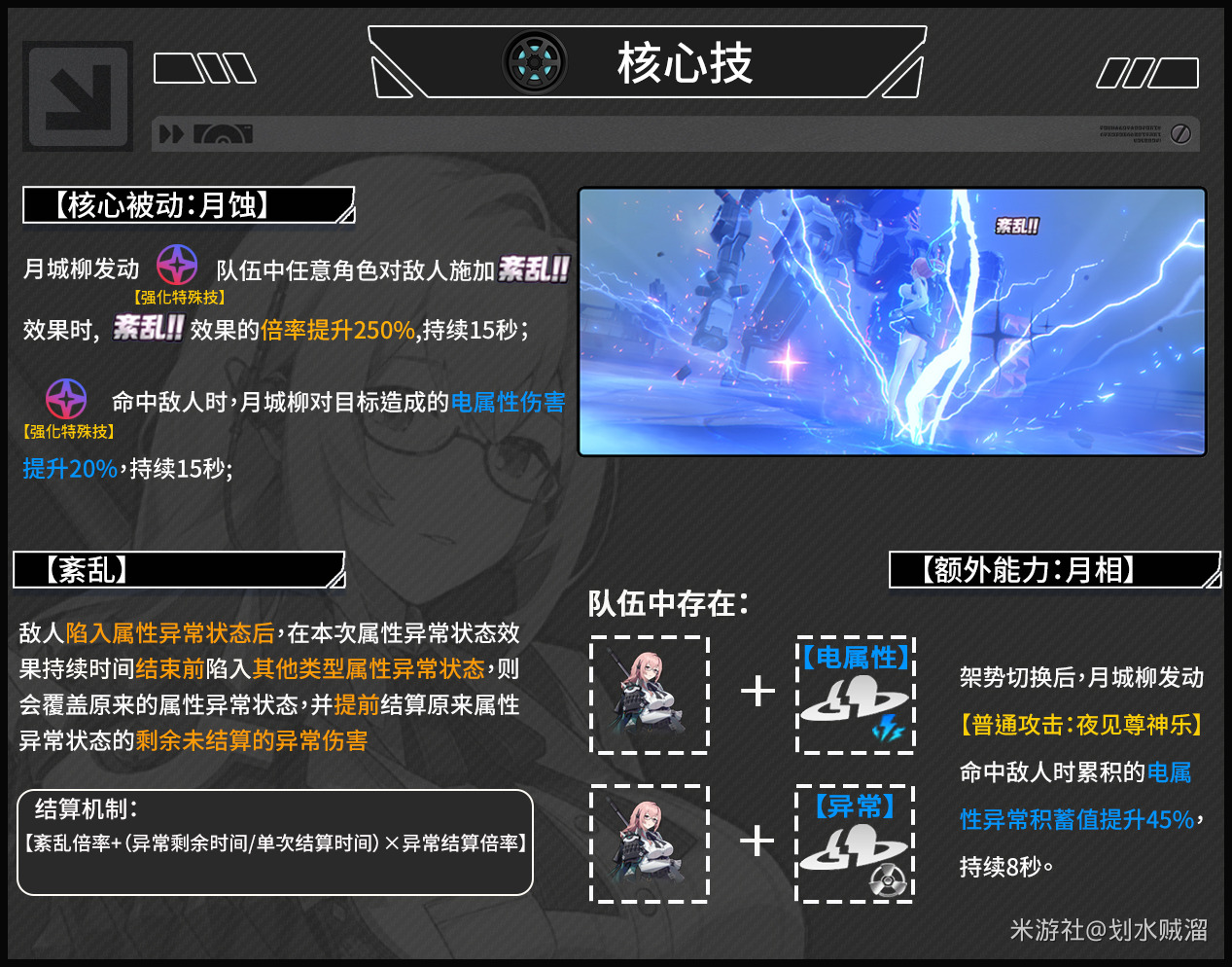 月城柳在释放【强化特殊技】能够提高全队施加紊乱时的伤害倍率;根据上面紊乱机制的解析,可以理解为在在原本的紊乱伤害基础的倍率以及异常伤害提前结算的倍率上在加上月城柳核心技提供的这部分倍率,即为这次触发紊乱的总倍率即: