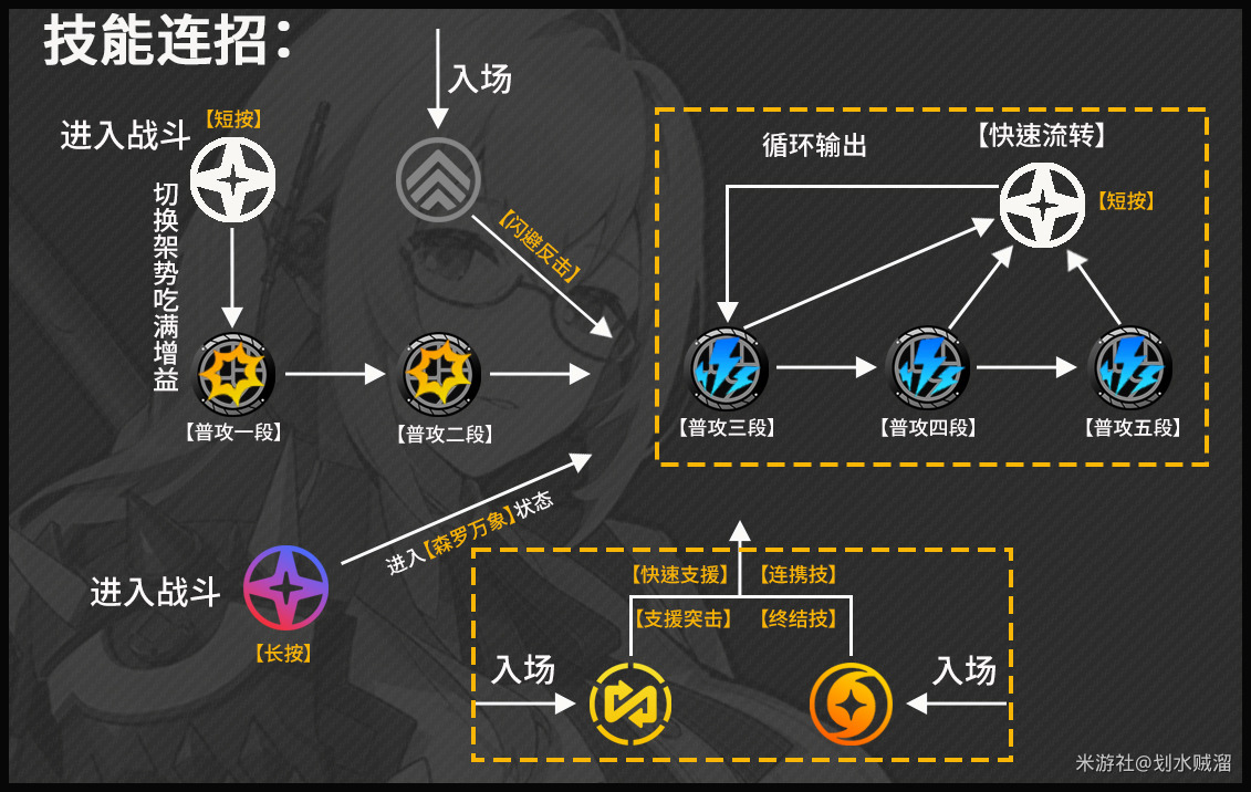 同时切换架势时能够格挡敌人攻击,因此在切换架势时也不必按部就班的在第五段攻击之后再进行衔接,也可在敌人攻击时当做“支援技”使用格挡敌人攻击,来灵活运用;也可通过【闪避反击】、【连携技】等方式直接衔接第三段开始进行输出;这里也是为大家准备了能够进入第三段【普攻攻击】的方式,方便大家理解