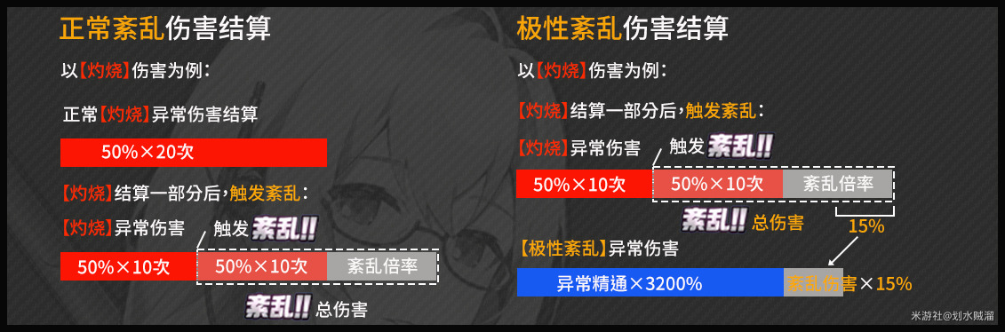 紊乱伤害是对不同类型的异常属性伤害在未结算完之前覆盖时伤害补正,避免异常伤害因其他异常属性伤害覆盖后的伤害丢失;以灼烧伤害结算为例作为简单理解: