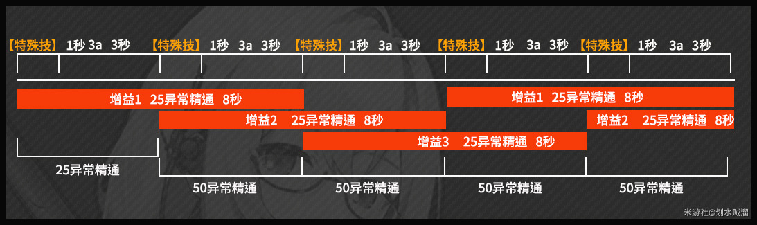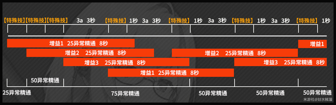 这里也是纳入了3层比较极端的情况给大家作为一个参考,通常3层较为难以触发 ,持续的时间较短;一套普攻大致需要3秒左右的时间,衔接【特殊技】切换架势大致为1秒左右时间也就是大致4秒左右,在打完第二轮衔接【特殊技】时,第一次触发的增益时间也就差不多消失了。方便各位小伙伴理解这里也是时间轴
