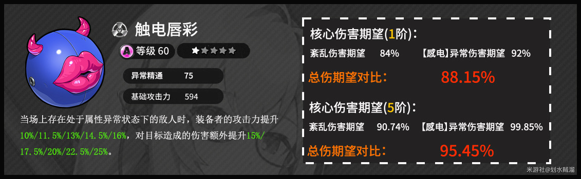 【触电唇彩】更多是偏向泛用,目前版本下还没办法获取到5阶的情况下,在月城柳的下位替代中不算特别强力也不算特别弱,但最近几个版本中连续出了 简、柏妮思、月城柳 三个限定五星异常角色,若抽取的较多以及在给月城柳队伍中另外一位异常角色分配音擎的情况下,加之培养角色刷取驱动盘,所需要的资源也比较多,很难去升级过多的音擎给角色分配,对大部分人而言,异常特性的音擎还是比较缺的。