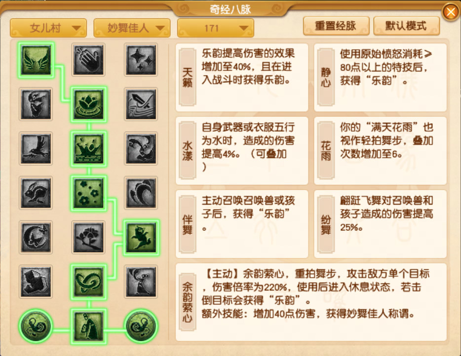 加点理由: 任务嘛,就是要效率!所以要优先考虑增加固定伤害的经脉,比如【暗伤】和【百花】。作为能秒7的固伤小能手,速度也是必不可少的,所以【花舞】也不能错过!