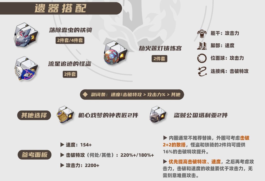 ①躯干和球:记住,攻击!攻击!还是TM的攻击!流萤这妹子有个神奇的“转模”机制,能把攻击力按比例转换成击破特攻,简直是变废为宝!所以,攻击力就是王道!当然,如果你是欧洲血统,副词条疯狂出速度和击破特攻,那当我没说,直接起飞!