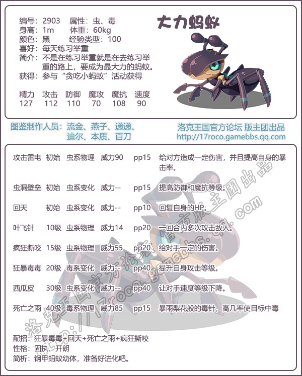 这大力蚂蚁,身高1米,体重60公斤(嗯,这体重可不是虚的,全是肌肉!),虫、毒双属性,简直就是个迷你版的举重运动员!它的生活格言就是:不是在举重,就是在去举重的路上!梦想只有一个:成为蚂蚁界的施瓦辛格!