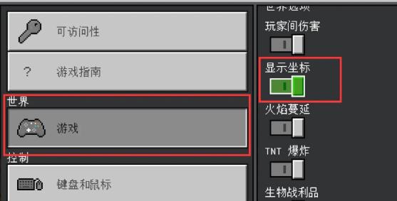 4、左边“游戏”选项,右边“显示坐标”,一键搞定,so easy!