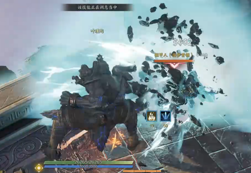 为了让大家更直观地了解千钧柱的“威力”,我特意截了张图。大家可以看到,这玩意儿的前摇实在是太长了!如果你直接对着敌人释放,那绝对是打不中的,只能在连招中使用。总而言之,这玩意儿用起来比较...抽象!