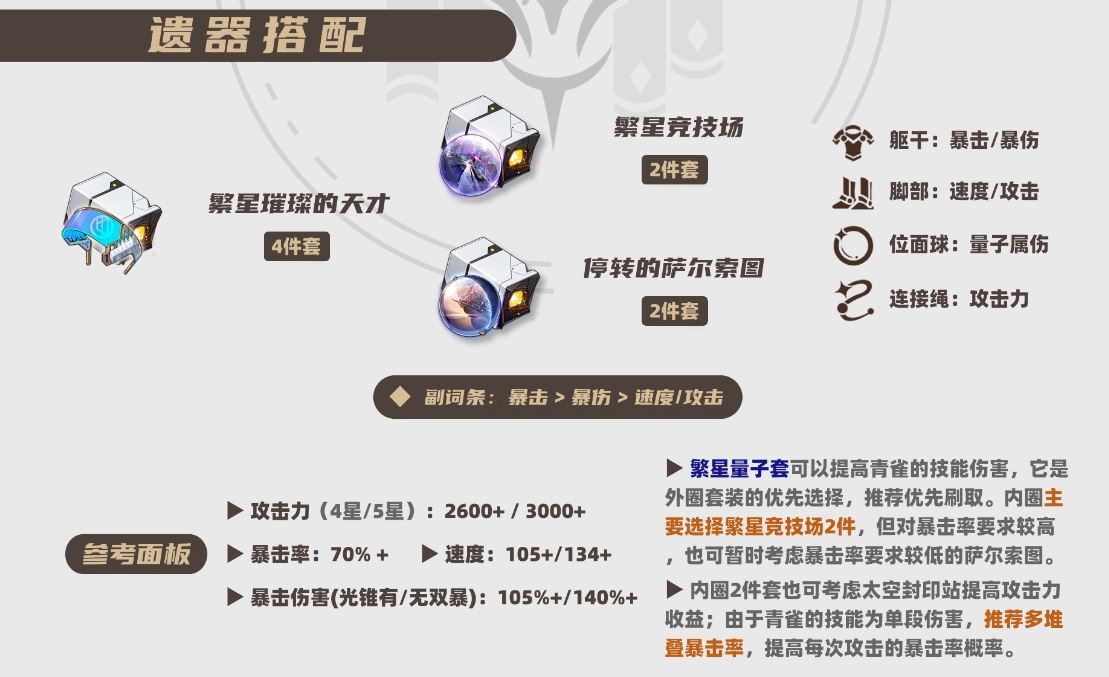 ① 外圈四件套: 必须是【繁星璀璨的天才】(量子套)!这可是量子属性角色的标配,穿上它,青雀的输出直接提升一个档次!当然,如果你还没凑齐,先用“量子套2件”混搭过渡一下也是可以的,毕竟好饭不怕晚嘛!