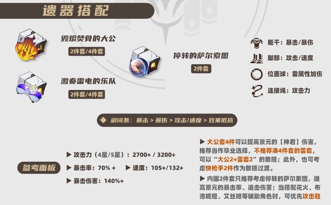 ① 外圈四件套的选择,就像给将军挑衣服,既要好看也要实用。目前来看,“毁烬焚骨的大公”(追击套)和“疾走雷电的乐队”(雷套)都是不错的选择。不过,雷套四件套的性价比嘛,只能说见仁见智,不建议大家头铁去刷。更推荐“2+2”的混搭风,时尚又百搭!