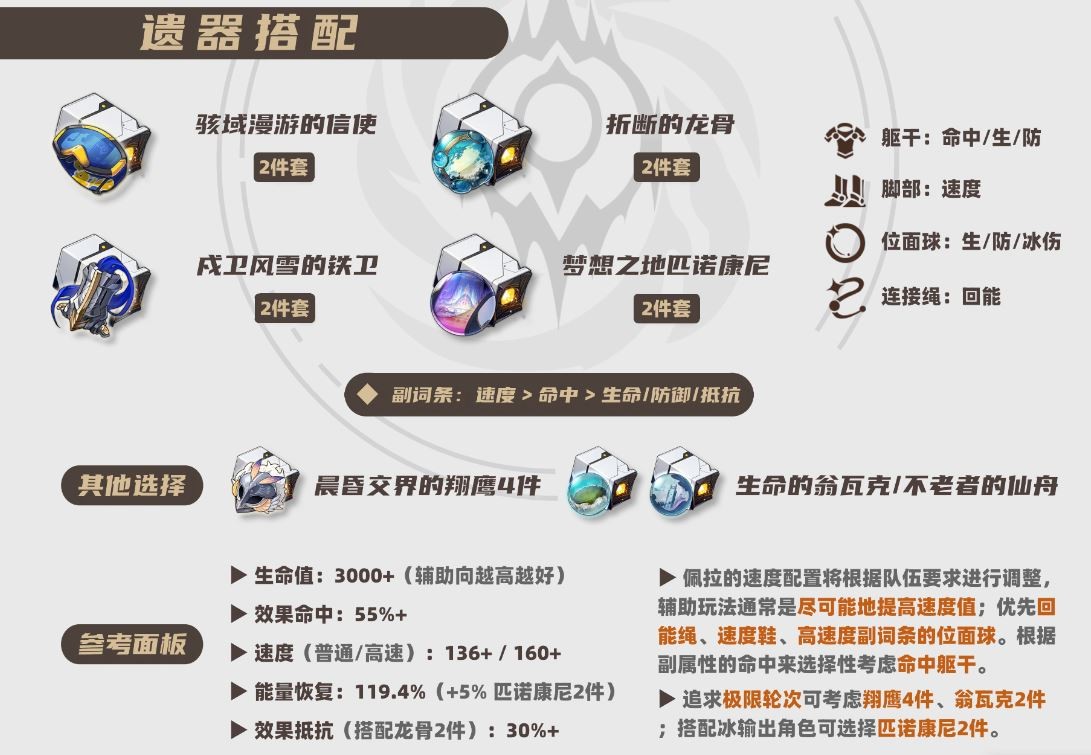 ② 内圈选择:仙舟龙骨保平安,匹诺康尼助冰伤! “仙舟2件”、“龙骨2件”,为佩拉提供全方位的生存保障。如果你的队伍里有冰属性C位大咖(镜流、彦卿、米沙再次登场!),那么【梦想之地匹诺康尼】2件就是锦上添花,让冰伤输出更上一层楼!