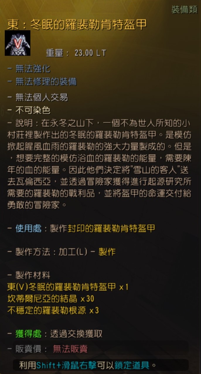 - 简易炼金(L) 东(V)罗裴勒肯特盔甲 + 坎蒂尔尼亚的结晶30个 + 不稳定的罗裴勒根源3个 = 封印的罗裴勒肯特盔甲!