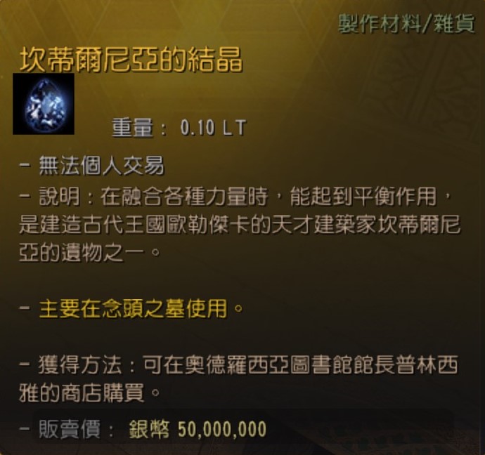 坎蒂尔尼亚的结晶:在奥德罗西亚的图书馆馆长普林西雅商店,花5亿银币购买。(5亿!贫穷限制了我的想象...)