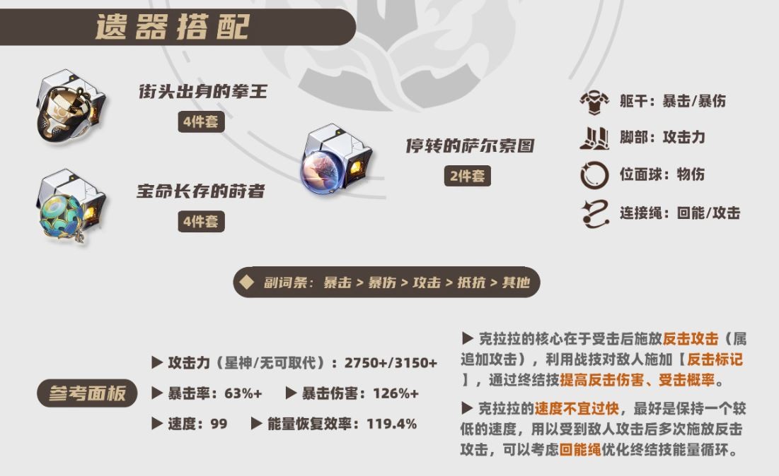 ③【遗器搭配】想让克拉拉火力全开?那必须是“街头出身的拳王”四件套,再配上“停转的萨尔索图”两件套,让她的小拳头打得敌人嗷嗷叫!什么?你觉得太死板?没问题!“拳王套两件+大公套两件”混搭风了解一下?既能秀肌肉,又能耍帅! 当然,如果你在刷量子本的时候,意外收获了一堆极品词条的“铁卫”四件套(我知道你们肯定偷偷留了一手,别装了!),那也不是不能用,毕竟好词条才是王道嘛!