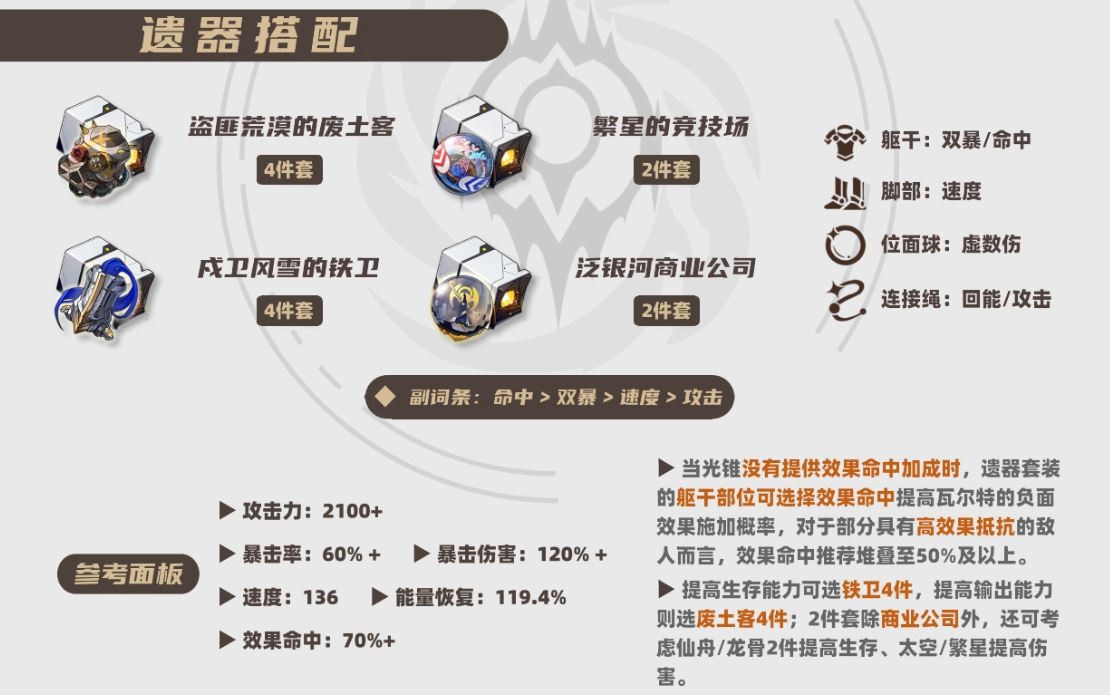 咳咳,正经点。想把瓦尔特打造成输出机器?那“盗匪荒漠的废土客”四件套加上“繁星竞技场”两件套,绝对让你伤害爆炸!不过,要是你的效果命中像个扶不起的阿斗,那就老老实实换上“泛银河商业公司”两件套,保你命中率蹭蹭往上涨!