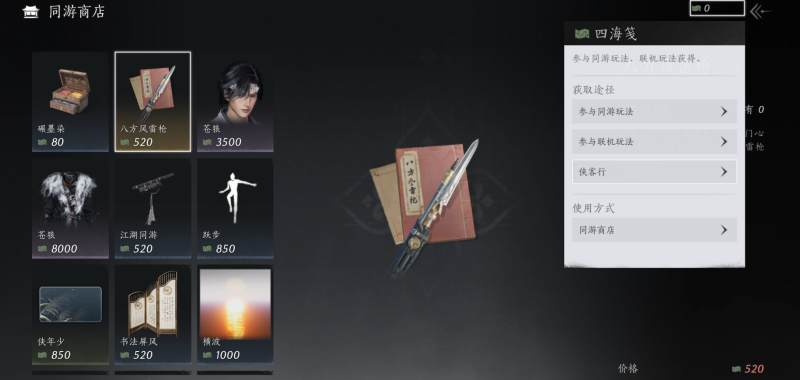 四海笺: 和其他玩家一起做同游玩法获得,用来换八方风雷枪心法以及各类外观。