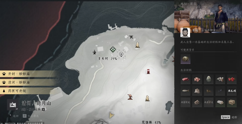粗矿石和粗毛皮需求量巨大,可以在生活杂物商处购买,每周刷新99个,建议前期多收集并且每周扫空商店。生活杂物商在清河和开封各有一个,位置如图。